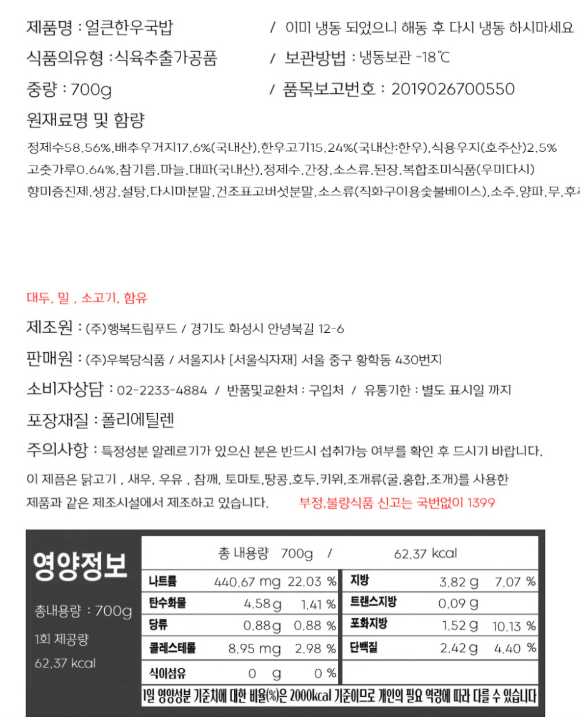 제조원: 행복드림푸드/경기도 화성시 안녕북길 12-6 판매원: ㈜우복당식품/경기도 안산시 상록구 동막1길 10