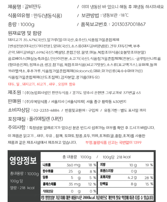 제조원: 농업회사법인 한만두식품(주)/경기도 양주시 은현면 그루고개로371번길63 판매원: ㈜우복당식품/경기도 안산시 상록구 동막1길 10