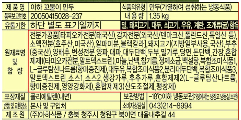 전분가공품(타피오카전분(태국산))감자전분(수입산:덴마트산.폴란드산.독일산등)소맥전분(호주산.미국산)알타미분.블랙킬라.돼지고기(지방일부사용.국산)부추(중국산)양배추.변성전분.양파.대파.대두단백.두부.밀가루.당면.돈단백.간장.혼합제제1(타피오카전분.말토텍스트린)마늘.난백.참기름.정제소금.백설탕.복합조미식품1,L-글루탐산나트륨(향미증진제)대두유.복합조미식품2.분리대두단백.복합조미식품3.말토덱스트린.소스1.소스2.생강가루.후추가루.혼합제제2(L-글루탐산나트륨.향미증진제.영양강화제)혼합제제3(산도조졸제.팽창제)밀.돼지고기.대두.쇠고기.우유.계란.조개류(굴) 함유