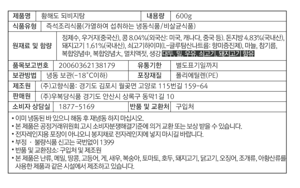 제조원: (주)고향식품/경기도 김포시 월곶면 고양로 115번길 159-64 판매원: ㈜우복당식품/경기도 안산시 상록구 동막1길 10